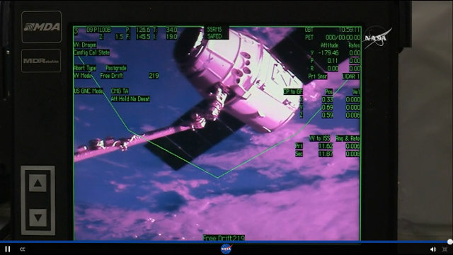 SpaceX Dragon space cargo ship captured by the International Space Station’s robotic arm in its CRS-9 mission (Image NASA TV)