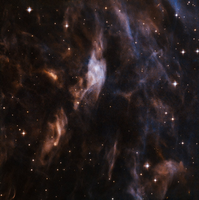 An image captured by the Hubble Space Telescope shows part of a nebula called Sh2-308 surrounding the star EZ Canis Majoris, a Wolf-Rayet star, a rare type of very massive star, over twenty times the mass of the Sun, and very hot that emits very strong solar winds. The star and the nebula are closely linked because the very strong solar winds push large amounts of ionized hydrogen that form a kind of temporary bubble around it.