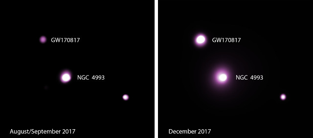An article published in the journal “Astrophysical Journal Letters” describes the analysis of the observations of the afterglow from the merger of two neutron stars detected last August and announced in October. A team of researchers used NASA’s Chandra X-ray observatory to study the consequences of that event noting that the glow continued, indicating that the gamma-ray burst generated from that collision is more complex than the scientists initially thought.