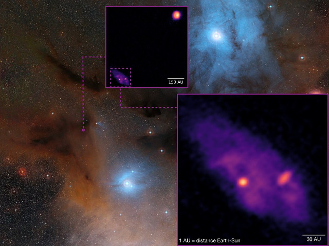 The bottom image (Courtesy MPE; background: ESO/Digitized Sky Survey 2; Davide De Martin. All rights reserved) shows a zoom in the Ophiuchus molecular cloud that highlights the IRAS 16293-2422 system with another protostar cataloged as B in the upper right corner and the protostars A1 and A2 in the lower left. The binary system in formation is shown in the lower right panel reproducing the top image.