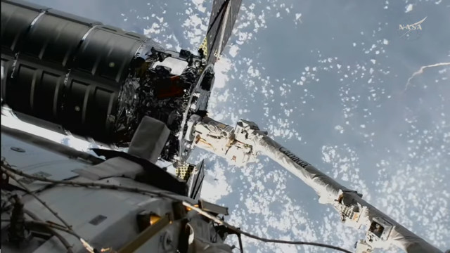 the Cygnus XL cargo spacecraft captured by the International Space Station's Canadarm2 robotic arm (Image NASA+)