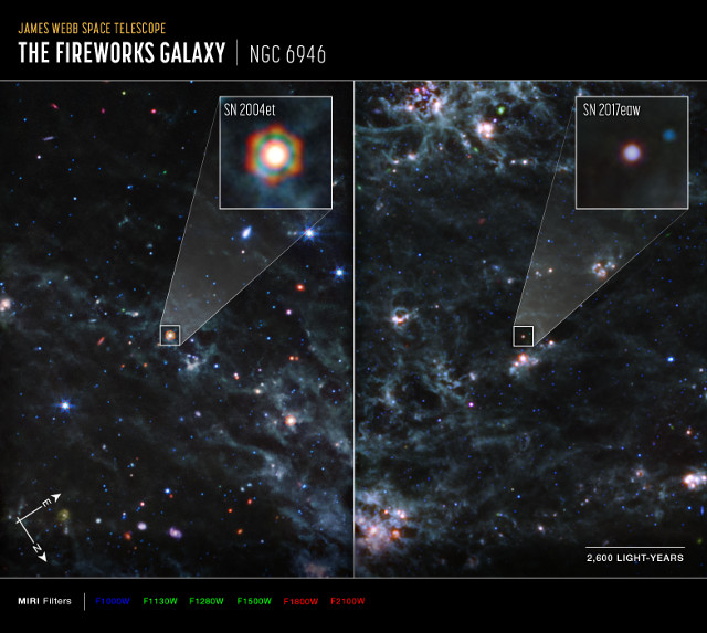 An article published in the journal “Monthly Notices of the Royal Astronomical Society” reports the identification of large amounts of dust from two supernovae in the galaxy NGC 6946. A team of researchers used the James Webb Space Telescope to find traces of dust coming from the supernovae SN 2004et and SN 2017eaw exploiting in particular the potential of the MIRI instrument. The result is the discovery of large amounts of dust among the material ejected from each of the two supernovae and this supports the theory that in the early universe, supernovae played a key role in producing dust.