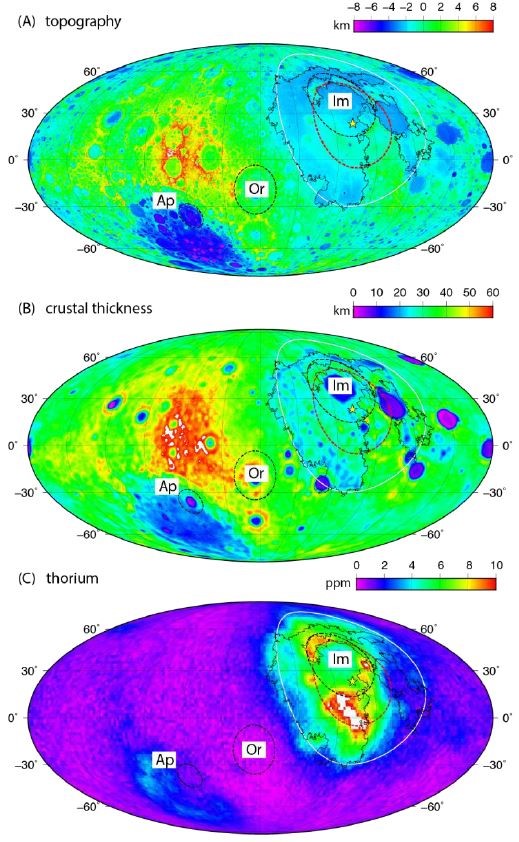 The image (Courtesy JGR: Planets/Zhu et al. 2019/AGU. All rights reserved) shows the topography (A), the crust thickness (B) and the distribution of thorium (C) on the Moon with the notable differences between the two faces. The black dotted lines represent the boundaries of the Imbrium (Im), Orientale (Or) and Apollo (Ap) basins.