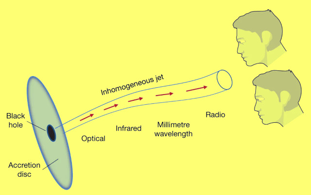 The researchers explored the possibility that the jet oriented towards the Earth actually has a certain variability in its orientation, confirming a theory already exposed by another team in an article published in the journal “Nature” in December 2017. The bottom image (Courtesy CM Raiteri et al., Nature. All rights reserved) illustrates that inhomogeneous jet model.