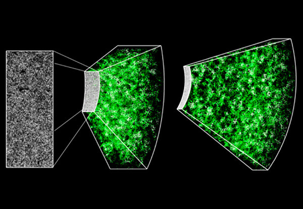 The image (Courtesy Jeremy Tinker and the SDSS-III collaboration. All rights reserved) shows a section of the three-dimensional map of the galaxies of the Sloan Digital Sky Survey used for this analysis. The rectangle on the left shows an area of sky that contains nearly 120,000 galaxies. The images in the center and on the right show the three-dimensional map created from those data: the brightest regions correspond to the regions of the universe with more galaxies while the darkest regions correspond to the voids.