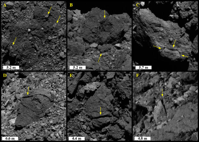 The top image (NASA/Goddard/University of Arizona) shows the disaggregation (top row) and linear fractures (bottom row) in rocks on asteroid Bennu. In the bottom row, the fracture orientation is from west-northwest to east-southeast (D) and from north to south (E, F). The bottom image (NASA/Goddard/University of Arizona) shows the exfoliation of a cliff face (A) and on rocks of various sizes and positions (B-F).