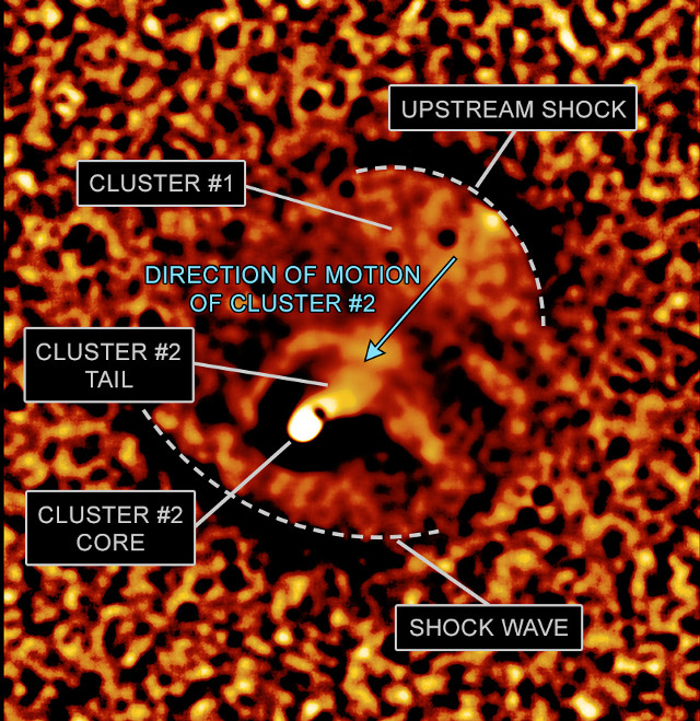 The bottom image (X-ray: NASA/CXC/Univ. of Nottingham/H. Russell et al.) shows a processing of Chandra’s X-ray data (purple) superimposed on an image at optical frequencies seen by the Subaru telescope (red and yellow). Cluster #2 is moving towards the bottom left through cluster # 1. The hot gas from cluster #2 is pushing a shock wave due to the collision with the gas from the other cluster, indicated by the dotted line. There’s also a second shock wave referred to as an upstream shock generated by an interaction of moving gas.