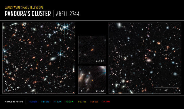 The two galaxies found thanks to the James Webb Space Telescope are shown in the image (Science: NASA, ESA, CSA, Tommaso Treu (UCLA). Image processing: Zolt G. Levay (STScI)): the galaxy cluster Abell 2744, nicknamed Pandora Cluster, with two boxes in the center showing the galaxies GLASS-z10 (1) and GLASS-z12 (2).