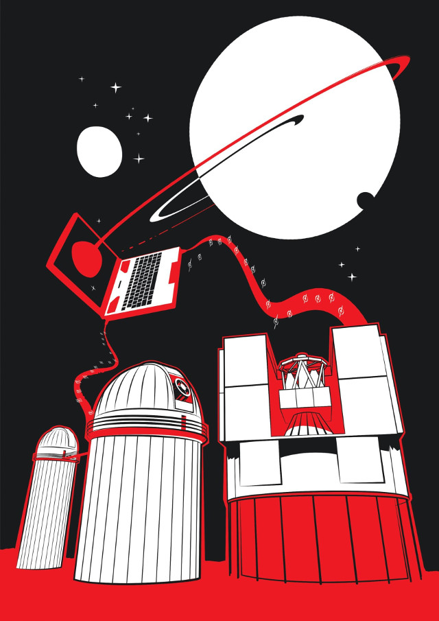 The authors of the study of TOI-1338/BEBOP-1 were trying to examine the exoplanet TOI-1338 b using the radial velocity method. They used two ESO spectrographs in Chile: HARPS (High Accuracy Radial velocity Planet Searcher), mounted on the 3.6-metre telescope at the La Silla Observatory, and ESPRESSO (Echelle SPectrograph for Rocky Exoplanet and Stable Spectroscopic Observations) mounted on the Very Large Telescope (VLT). However, the traces they found turned out to be from another exoplanet, the one cataloged as BEBOP-1 c. The image reproduces the TOI-1338/BEBOP-1 system, the two telescopes, and instruments used to find the new exoplanet celebrating the event.