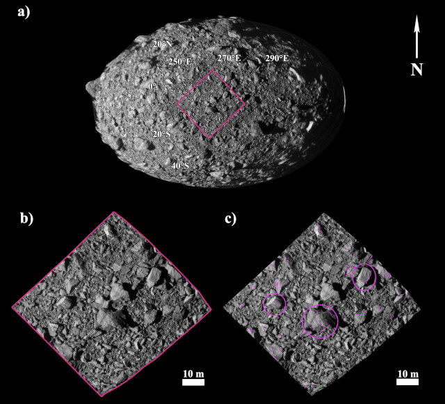 The image (NASA/Johns Hopkins Apl) shows an image of the asteroid Dimorphos (a) with a magnified area (b) that was analyzed in one of the articles and a mapping of the fractures of the boulders (c).